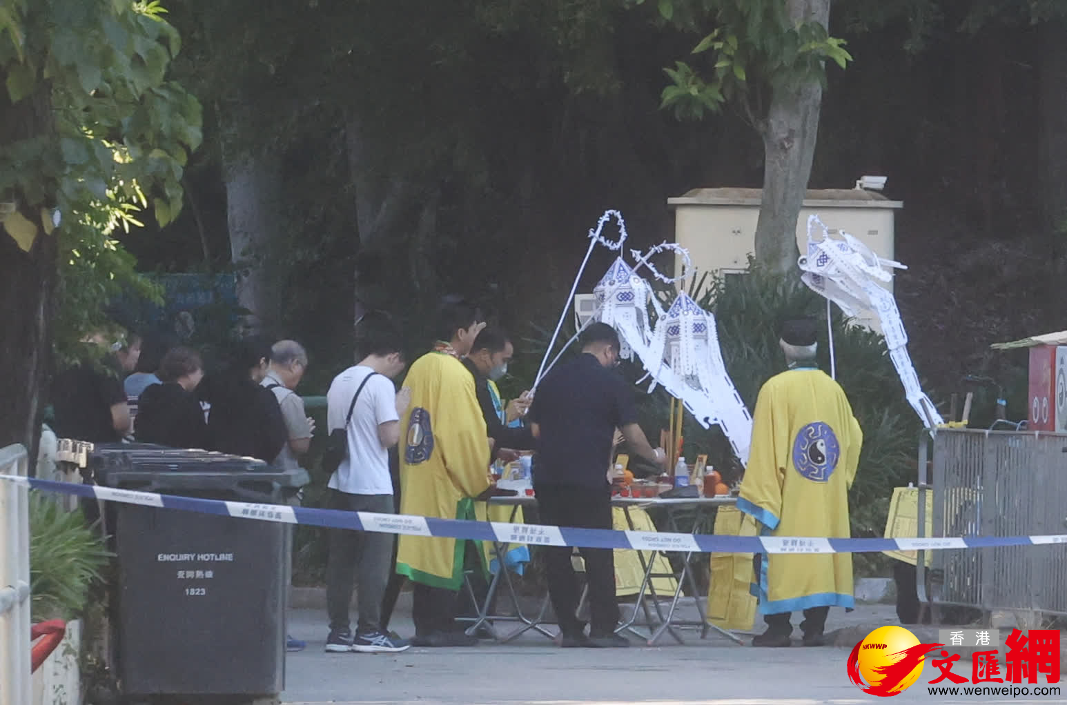 但見逝者家屬分批由旅遊巴接載抵達後,先將攜同香燭及祭品等擺放在檯上,再由身穿黃色袍道士帶領下進行招魂儀式;其間家屬燒香合什拜祭,有家屬難掩哀傷痛哭,見者心酸。