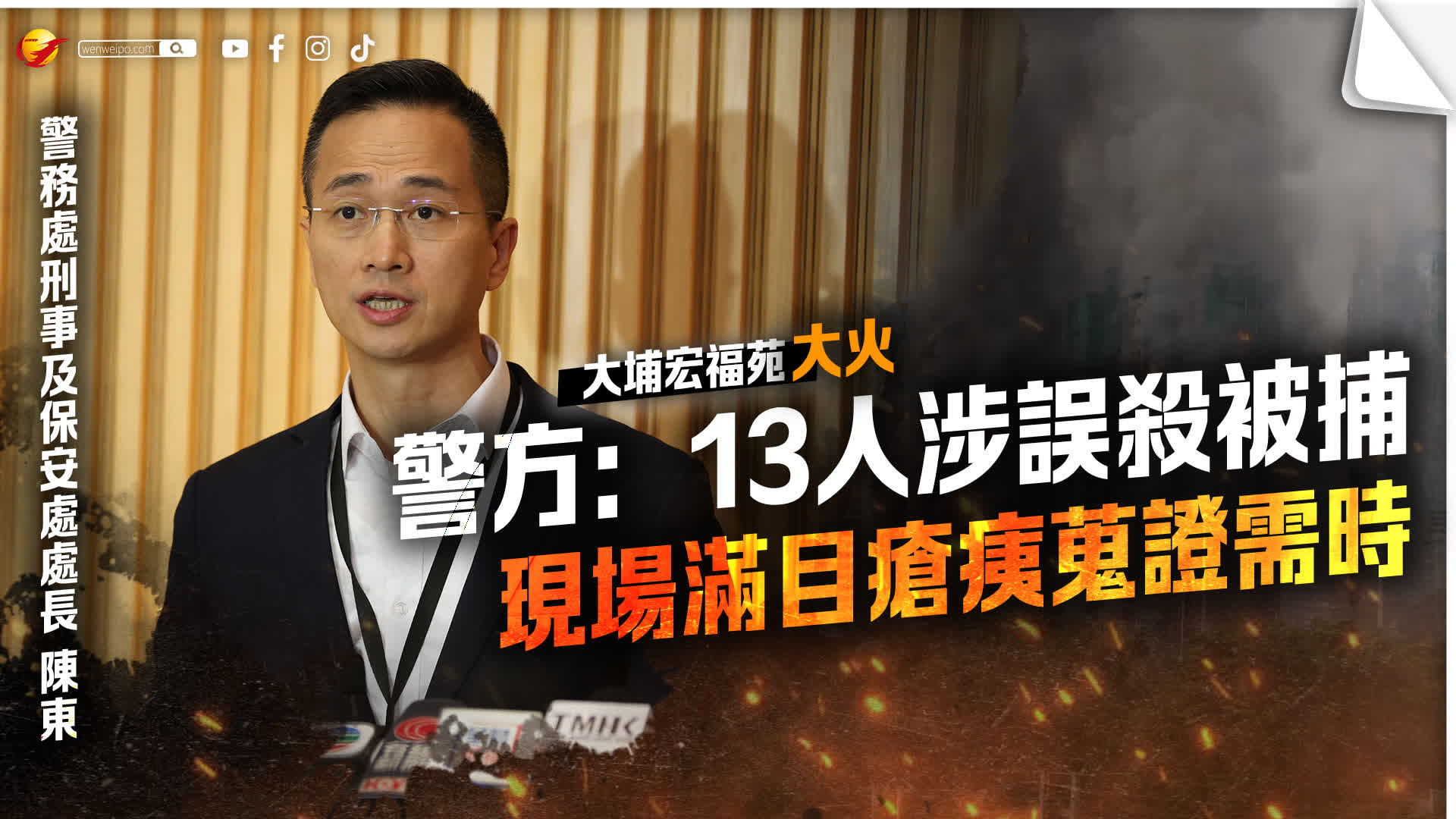大埔宏福苑11月26日發生五級大火,奪走逾百條人命,焚燒逾43小時才被救熄。警務處刑事及保安處處長陳東今日(12月1日)見記者交代案件最新進展。警方表示,至今以涉嫌誤殺拘捕13人,調查仍在進行中,不排除有更多人被捕。陳東表示,由於災場覆蓋範圍大,涉及單位及死者人數眾多,受影響的住所滿目瘡痍,現場光線嚴重不足,相信調查蒐證仍需時間。