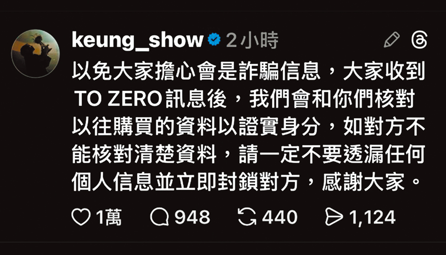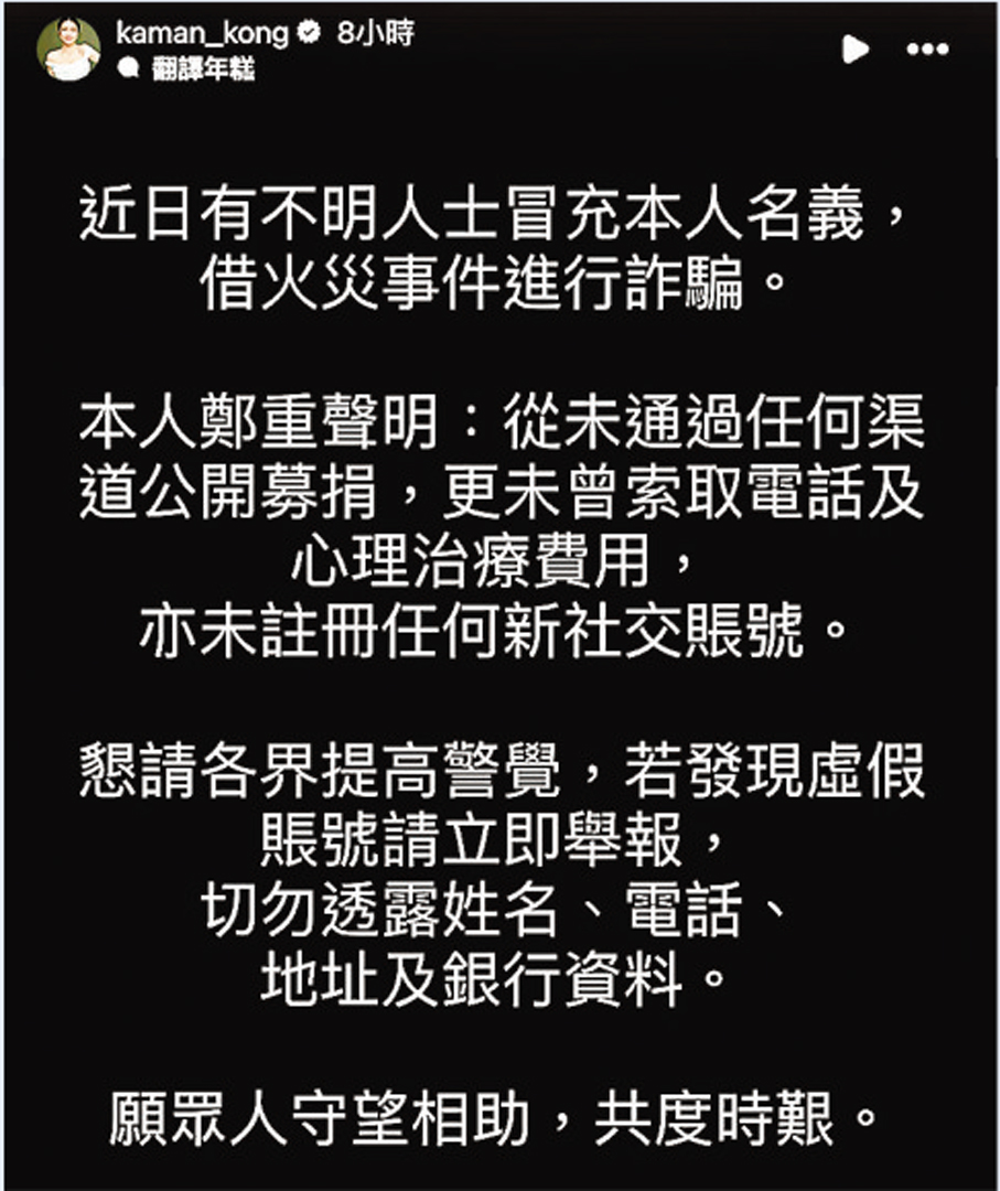 江嘉敏隨即透過社交平台,以白底黑字發表嚴正聲明,澄清道:「本人鄭重聲明:從未通過任何渠道公開募捐,更未曾索取電話及心理治療費用,亦未註冊任何新社交賬號。懇請各界提高警覺,若發現虛假賬號請立即舉報。」她並提醒大眾務必保護個人私隱,「切勿透露姓名、電話、地址及銀行資料。願眾人守望相助,共渡時艱。」