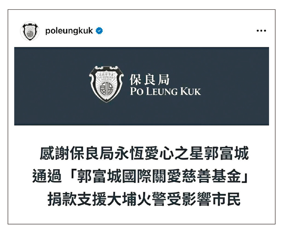 演藝界善心從不間斷,郭富城向保良局捐出100萬港元賑災;由歷屆香港小姐成立的「慧妍雅集」亦與香港同心同行,其中三位前港姐趙雅芝、陳法蓉及曹敏莉合共捐出70萬港元;樂隊Supper Moment對受災居民深感悲痛,亦希望略盡綿力,捐出30萬港元至認可募捐平台,用以支援宏福苑災民及其家屬。