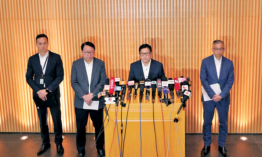 陳國基昨日聯同保安局局長鄧炳強、廉政專員胡英明和警務處刑事及保安處處長陳東,公布大埔宏福苑火災跟進調查進度。