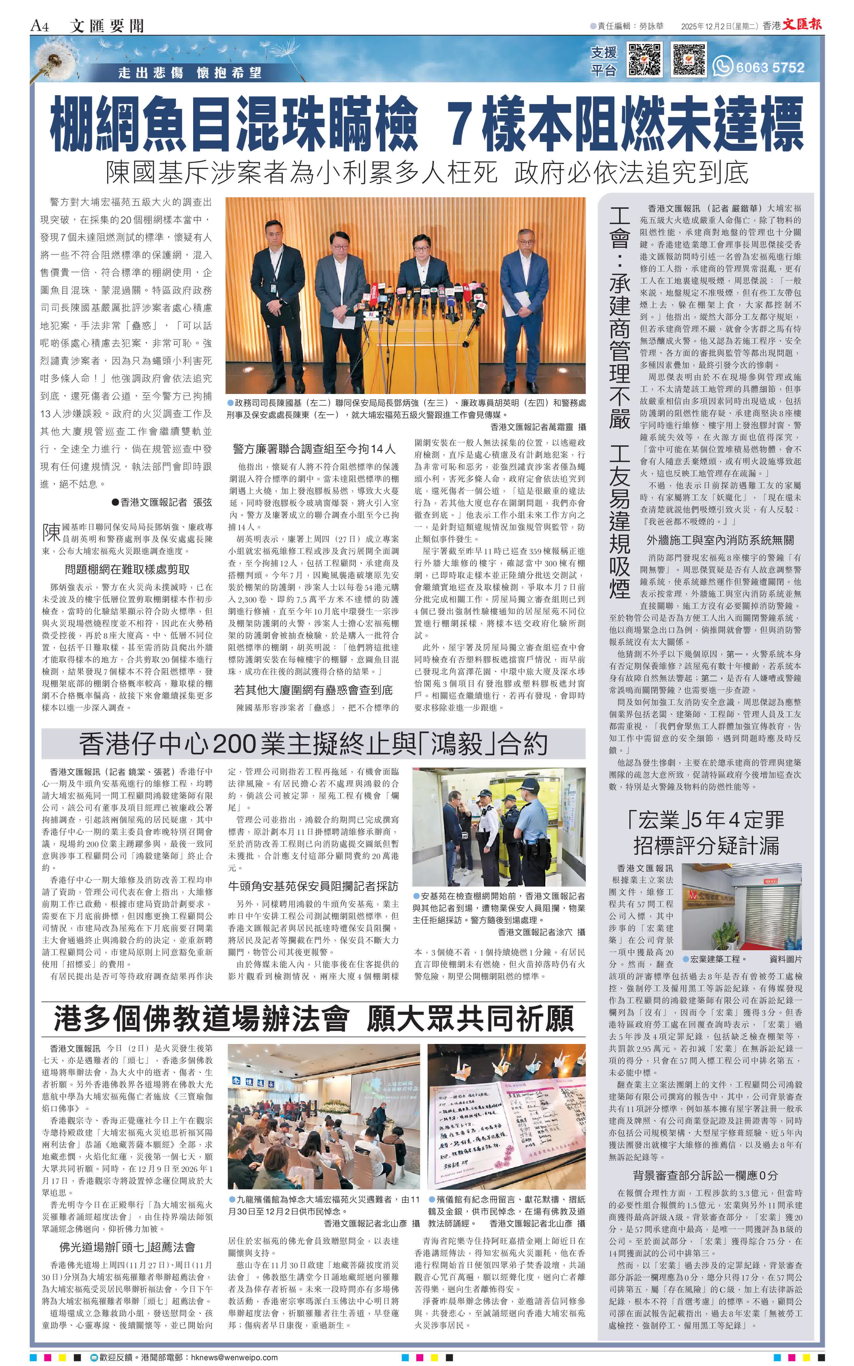 (香港文匯報記者 張弦)警方對大埔宏福苑五級大火的調查出現突破,在採集的20個棚網樣本當中,發現7個未達阻燃測試的標準,懷疑有人將一些不符合阻燃標準的保護網,混入售價貴一倍、符合標準的棚網使用,企圖魚目混珠、蒙混過關。特區政府政務司司長陳國基嚴厲批評涉案者處心積慮地犯案,手法非常「蠱惑」,「可以話呢啲係處心積慮去犯案,非常可恥。強烈譴責涉案者,因為只為蠅頭小利害死咁多條人命!」他強調政府會依法追究到底,還死傷者公道,至今警方已拘捕13人涉嫌誤殺。政府的火災調查工作及其他大廈規管巡查工作會繼續雙軌並行、全速全力進行,倘在規管巡查中發現有任何違規情況,執法部門會即時跟進,絕不姑息。
