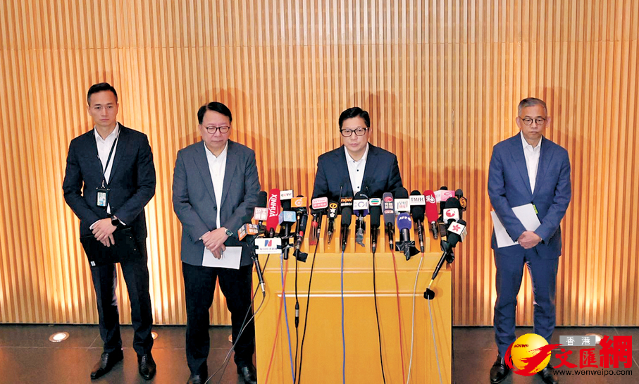 陳國基昨日聯同保安局局長鄧炳強、廉政專員胡英明和警務處刑事及保安處處長陳東,公布大埔宏福苑火災跟進調查進度。