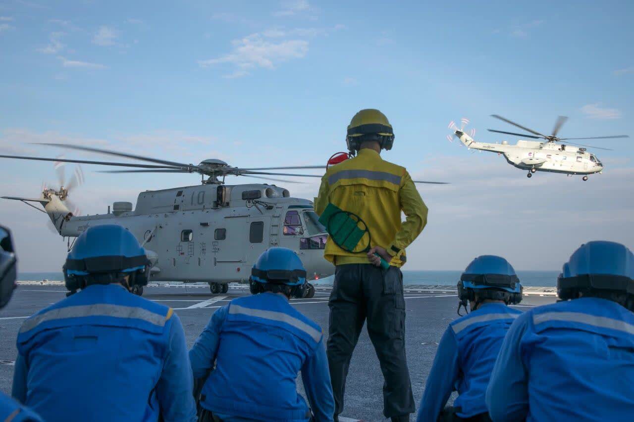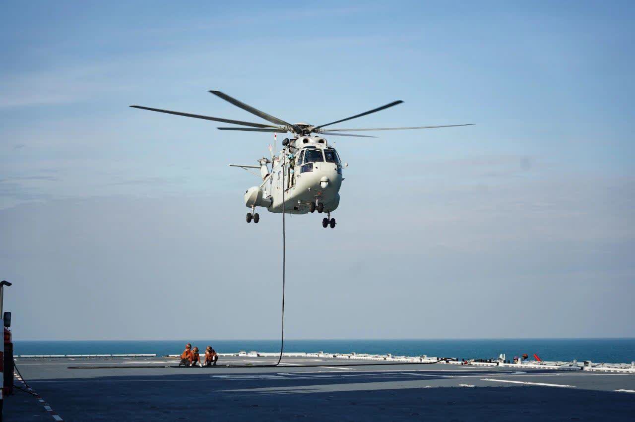 「可以起飛!」在湖北艦甲板上,甲板引導員解開直升機與甲板系留繩索,數架艦載直升機從寬闊的甲板騰空而起,隨即圍繞快速起降懸停加油等課目展開專攻精練。
