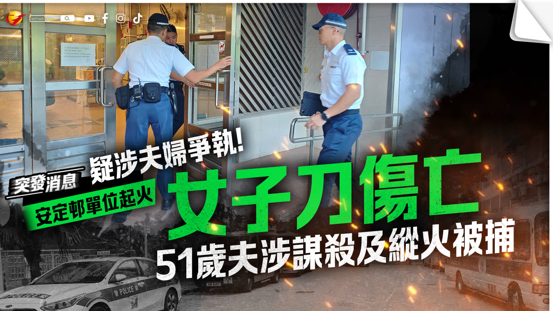 香港文匯報訊(記者 蕭景源)今日(2日)早上近7時,屯門安定邨定福樓一單位發生火警,不斷冒出濃煙,由屋苑保安員發現報警。消防員接報趕至開喉射水灌救,迅速將火救熄,單位內一對同任職保安員夫婦受傷,其中50歲姓陳妻子重傷昏迷,面部有刀傷及燒傷痕跡,其51歲姓洪丈夫則手部擦傷,兩人由救護車送屯門醫院經搶救,妻子傷重死亡。消防員初步調查,火警有可疑,警方列作謀殺及縱火案處理,丈夫涉嫌謀殺罪名被捕,案件交由屯門警區重案組第一隊跟進,正深入調查案發原因。