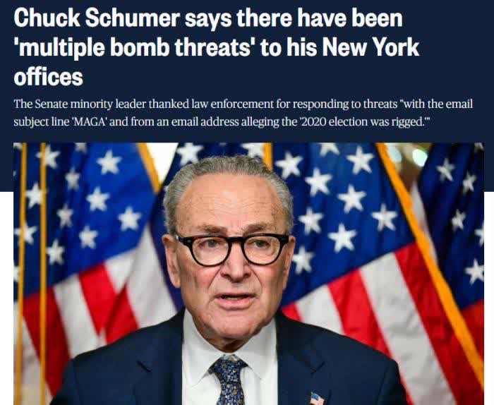 據報道,舒默在一份聲明中表示,紐約執法部門通知稱,他在紐約羅切斯特、賓厄姆頓和長島的辦公室收到了炸彈威脅郵件,郵件主題為「MAGA」(讓美國再次偉大)。