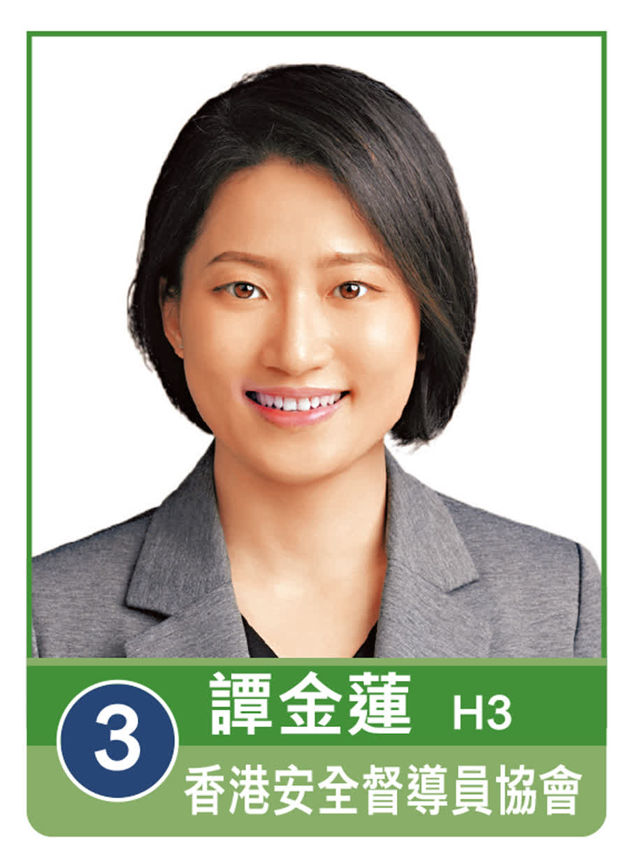 H3號候選人譚金蓮以「保障勞工、賦能婦女」為核心政綱,內容分為勞工權益保障與婦女發展支援兩大部分,提出推動職業安全健康文化普及、擴大職業病保障、強化本地勞工合理就業權益、全面支援女性發展等多方面的建議,期望建設更安心、更有溫度、宜居宜業的美好香港。