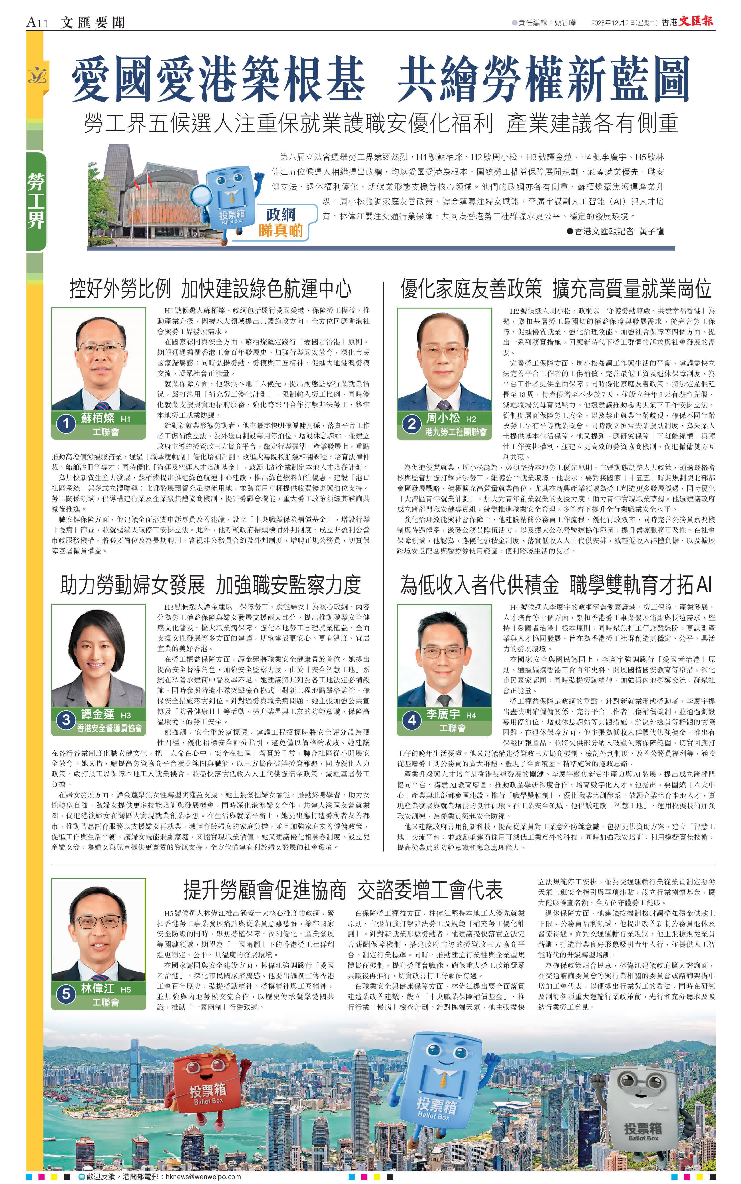 H2號候選人周小松,政綱以「守護勞動尊嚴、共建幸福香港」為題,緊扣基層勞工最關切的權益保障與發展需求,從完善勞工保障、促進優質就業、強化治理效能、加強社會保障等四個方面,提出一系列務實措施,回應新時代下勞工群體的訴求與社會發展的需要。