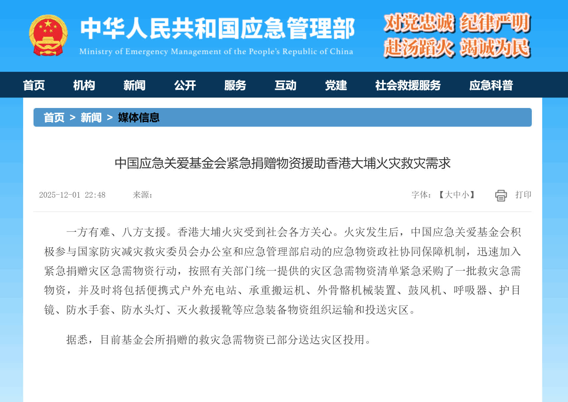 一方有難、八方支援。香港大埔火災受到社會各方關心。火災發生後,中國應急關愛基金會積極參與國家防災減災救災委員會辦公室和應急管理部啟動的應急物資政社協同保障機制,迅速加入緊急捐贈災區急需物資行動,按照有關部門統一提供的災區急需物資清單緊急採購了一批救災急需物資,並及時將包括便攜式戶外充電站、承重搬運機、外骨骼機械裝置、鼓風機、呼吸器、護目鏡、防水手套、防水頭燈、滅火救援靴等應急裝備物資組織運輸和投送災區。