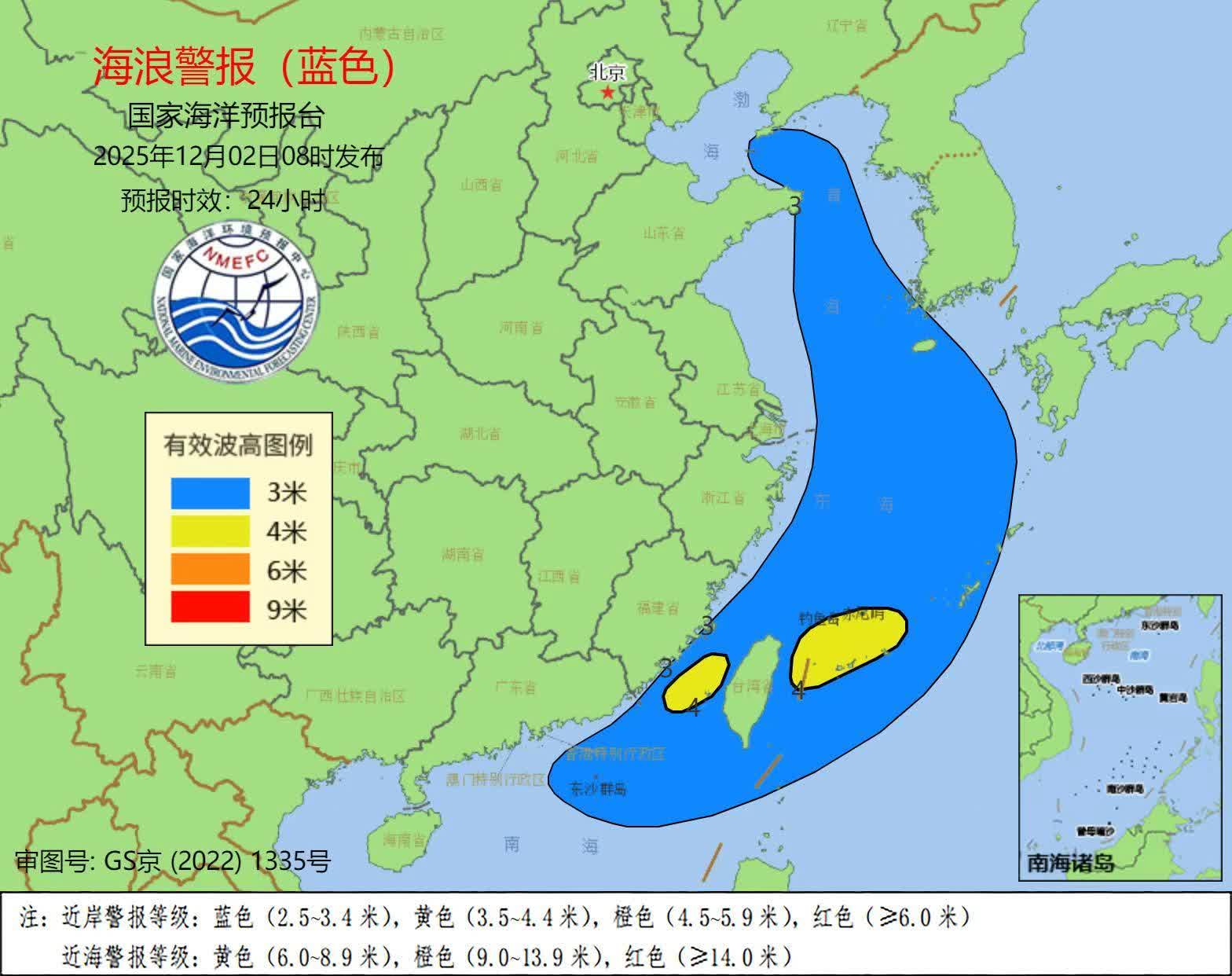 受較強冷空氣的影響,預計12月2日上午到3日上午,渤海、黃海北部將出現2.5到3.8米的大浪區,黃海南部、東海、台灣海峽將出現3到4米的大浪到巨浪區;遼寧、山東北部、東部、福建近岸海域將出現2到3米的中浪到大浪,近岸海域海浪預警級別為藍色。請在上述海域作業的船隻注意安全,沿海各有關單位提前採取防浪避浪措施。