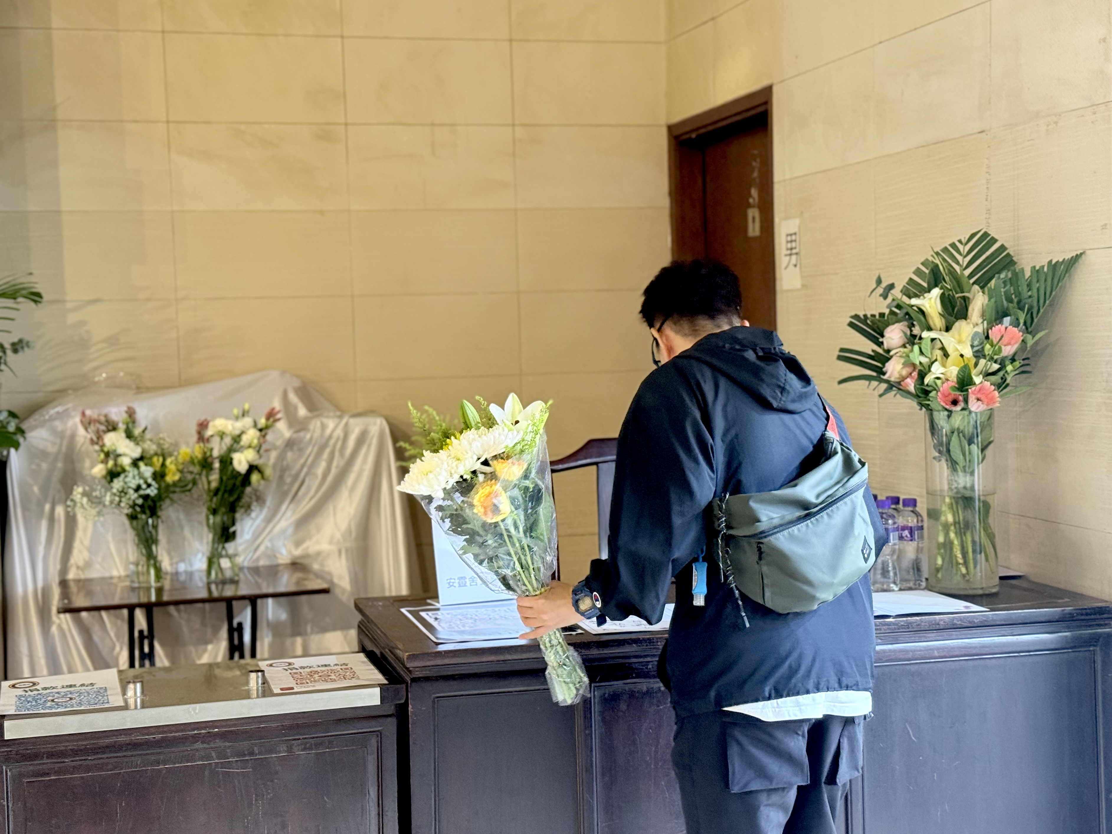 今日上午10時許到場,見九龍殯儀館內外已有多束市民帶來的鮮花,附有「大埔宏福苑火災眾遇難者往生淨土」等弔唁留言,氛圍安靜肅穆。殯儀館內設有鮮花台、祭品台,亦設有弔唁留言及為災民捐款的二維碼,此外還有燭光區供市民點燃蠟燭並默哀,悼念亡者。眾多市民默哀之餘亦自發折疊蓮花、元寶等祭祀用品,以祭奠遇難者。