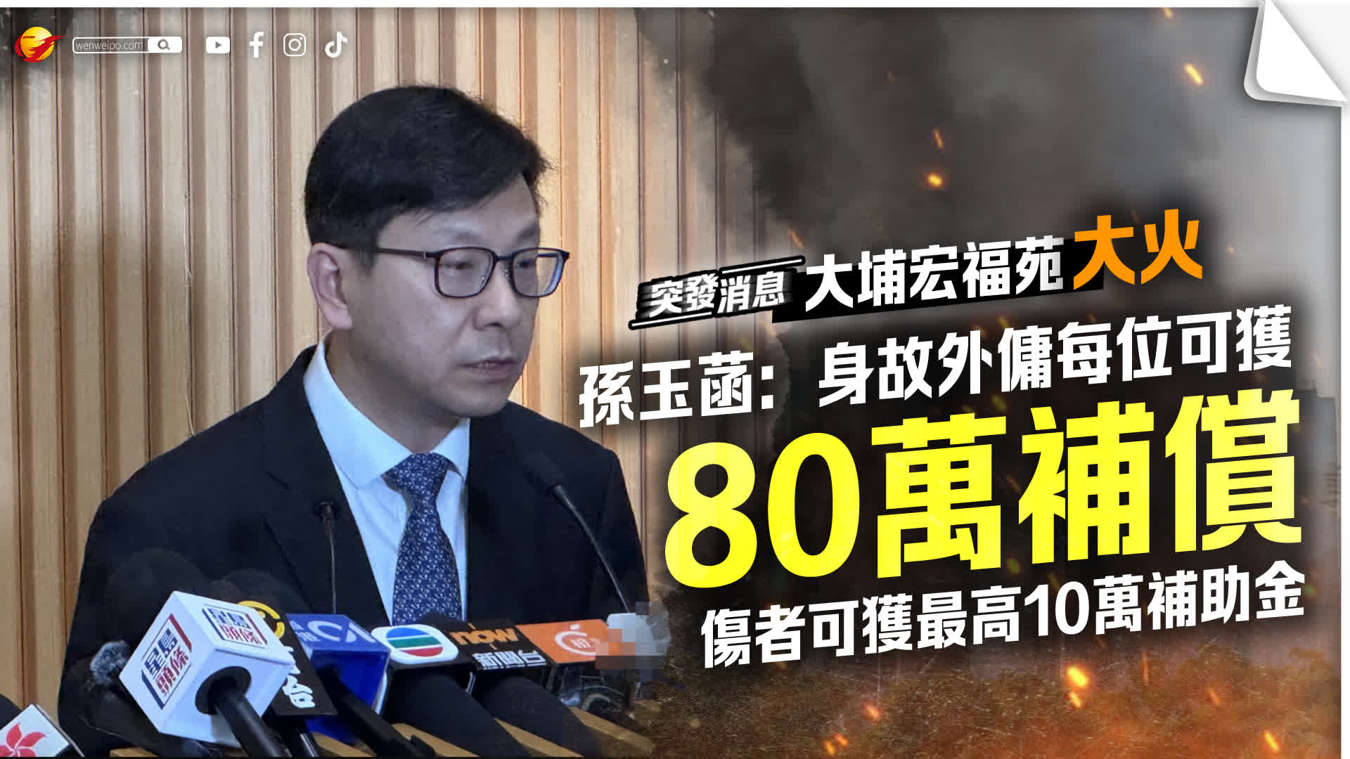 孫玉菡指出,在宏福苑大火中不幸身故的外傭,將獲得法定補償,初步估計金額超過50萬港元。此外,政府將提供一筆20萬港元的一次性恩恤金,以及5萬港元的補助金。總計,每位身故外傭的補償總額估計約為80萬港元。