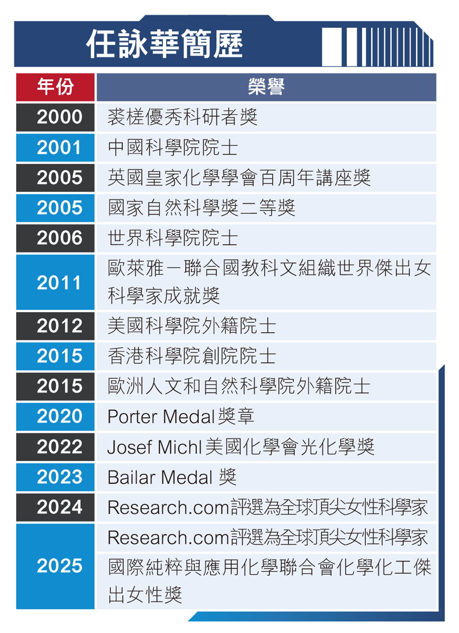 任教授以科教興國為己任,並身體力行實現這個方向;回想成立香港科學院的契機,亦與這使命密不可分。2001年,香港有六位科學家同時當選中國科學院院士,任教授是其中之一,當年她38歲,成為了該院最年輕院士。隨着愈來愈多本地科學家成為其他科學院的院士,自2003年起,本地科學界開始討論香港是否也應成立自己的科學院。