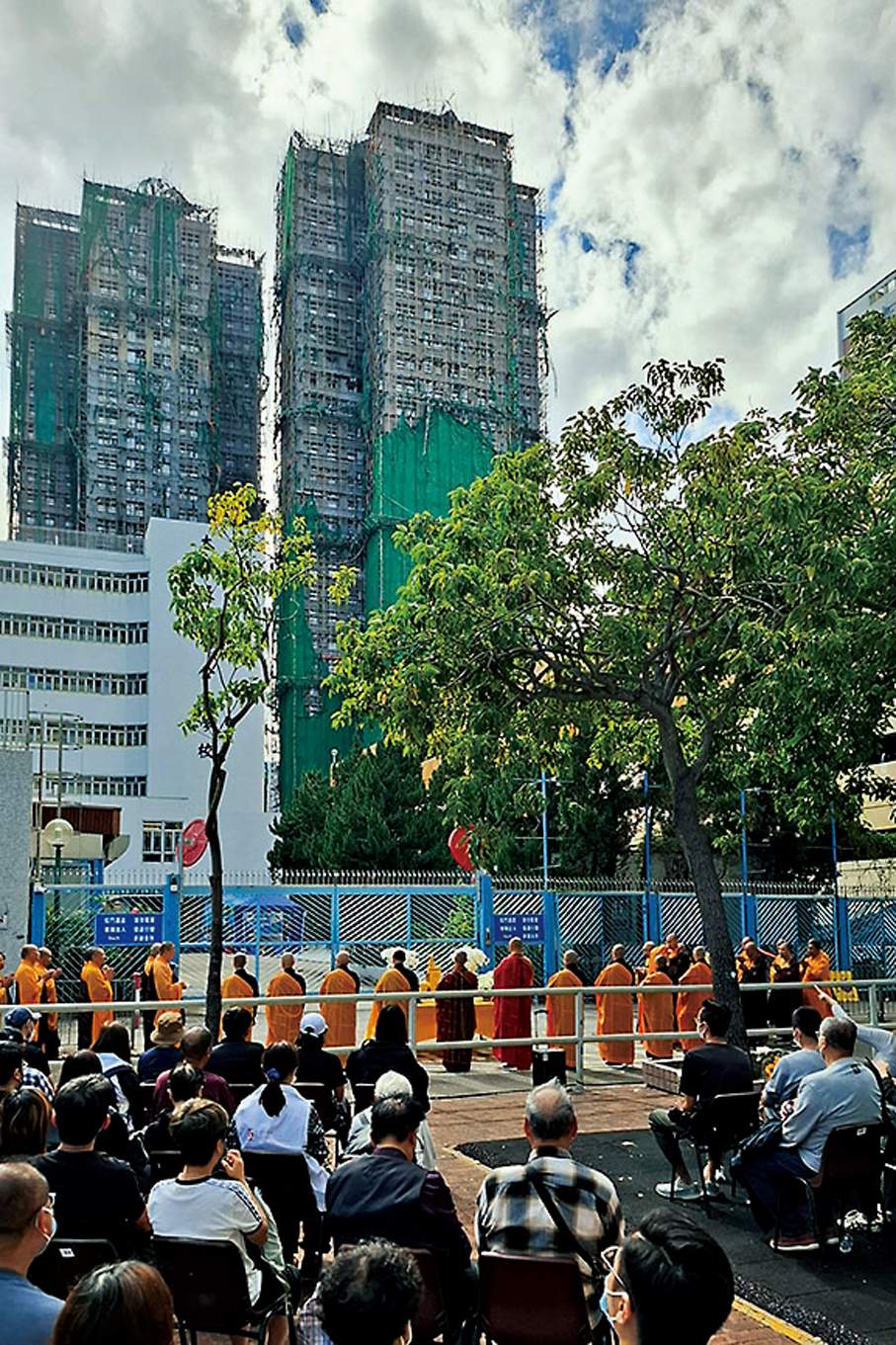 昨日是火災罹難者「頭七」, 香港佛教聯合會下午到火災現場為罹難者舉辦誦經超度法會。法會由佛聯會會長寬運法師、寶蓮禪寺方丈淨因法師率諸山大德主持,包括佛聯會董事會提輪法師、僧徹法師、智德法師、演慈法師、悟藏法師、修岸法師、衍璇法師等30位法師。法會誦《佛說阿彌陀經》、《心經》、《往生咒》等等經咒。在政府相關部門的安排下,法會中有約200名罹難者親友出席。