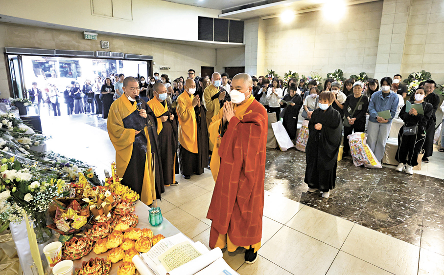 大火後,九龍殯儀館自上月30日起一連三日開放禮堂供市民悼念大埔宏福苑遇難者,昨日來到最後一日。香港文匯報記者於上午11時到場,陸續有市民到場獻花、悼念以及摺金銀紙錢,午後人流開始增多,不少市民與學生到場哀悼。佛教誦經儀式開始後,禮堂內的市民起身,跟隨僧侶一同念誦《地藏菩薩本願經》,有市民一邊誦讀、一邊用紙巾拭淚。