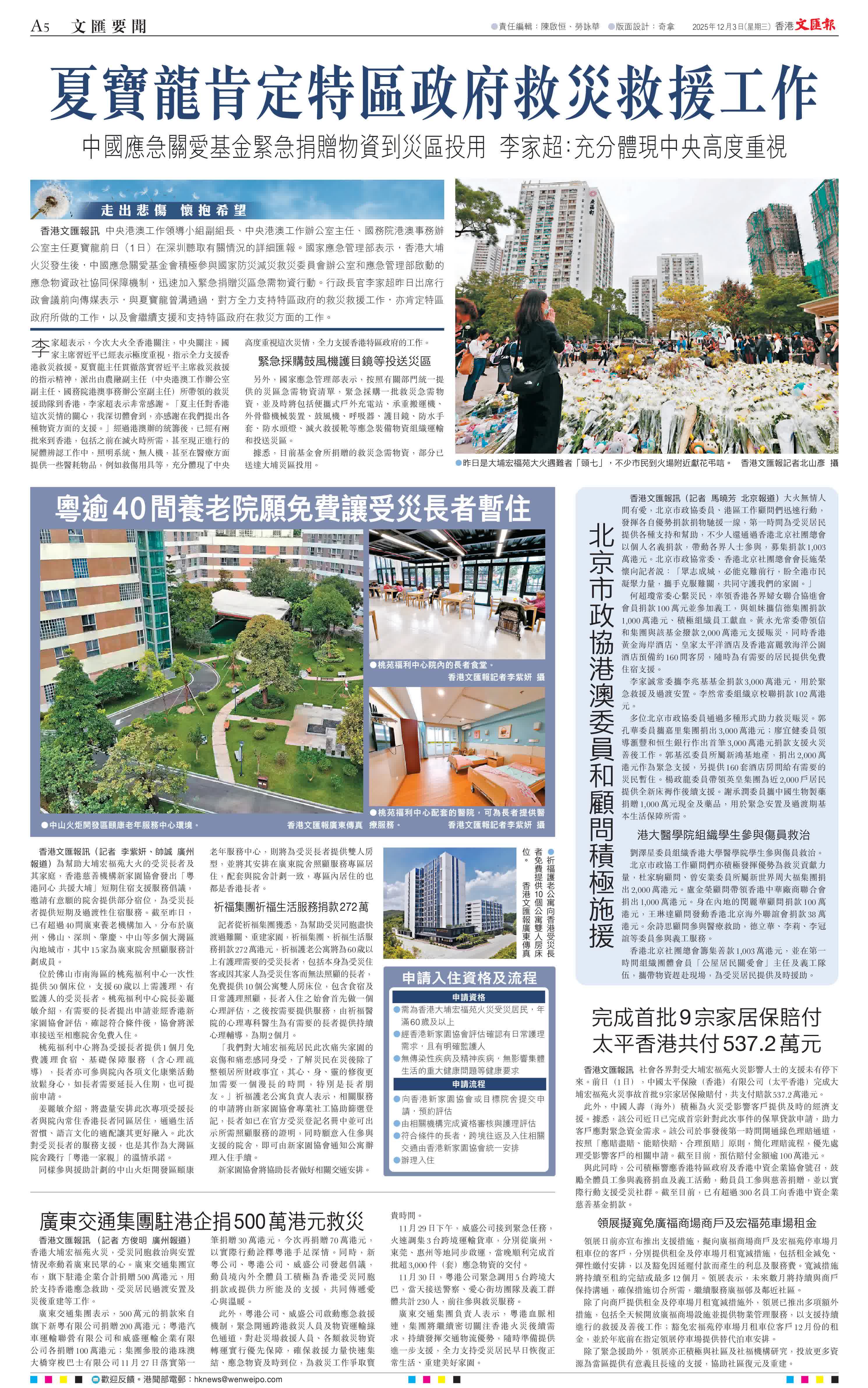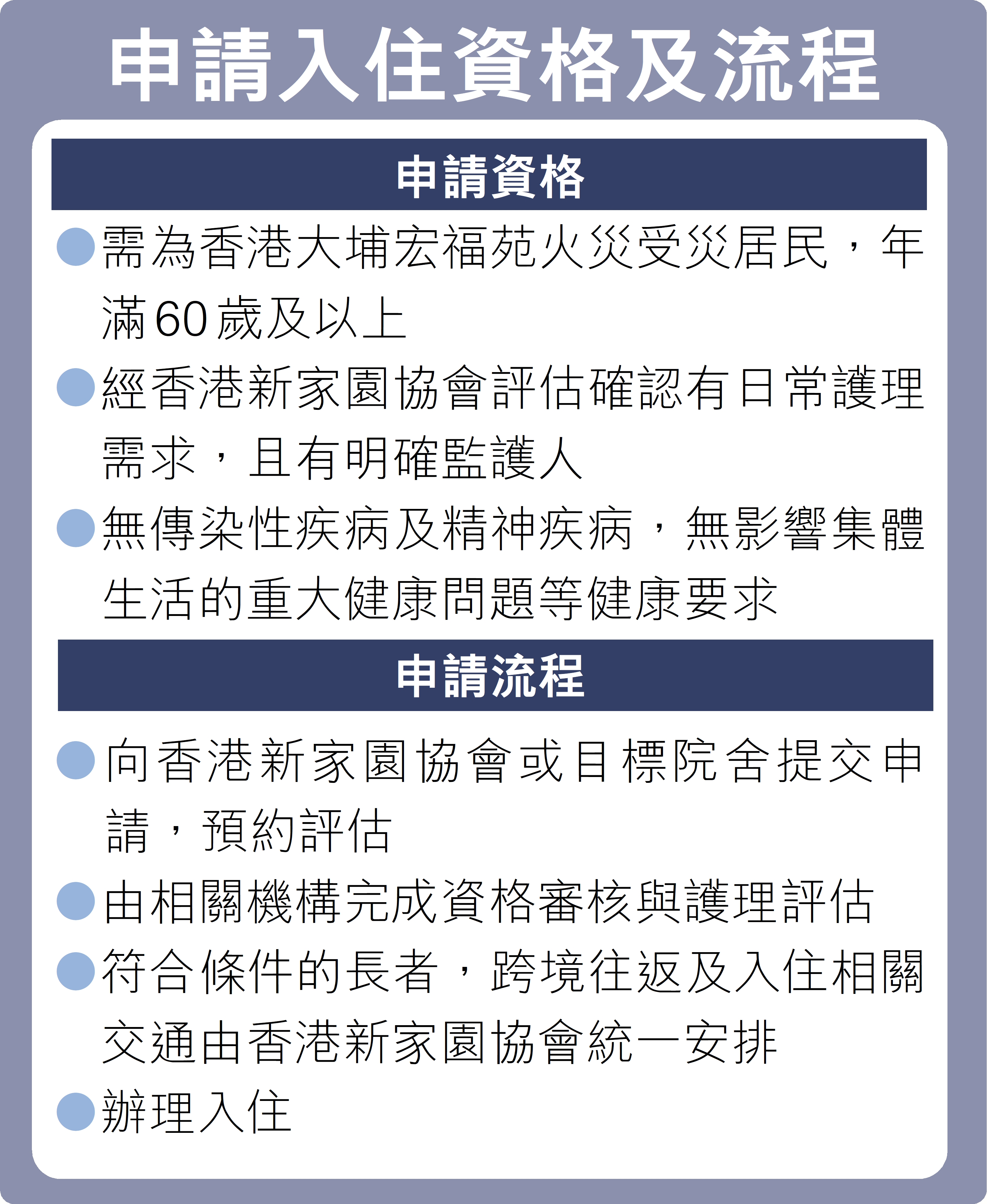 「我們對大埔宏福苑居民此次痛失家園的哀傷和痛悲感同身受,了解災民在災後除了整頓居所財政事宜,其心、身、靈的修復更加需要一個漫長的時間,特別是長者朋友。」祈福護老公寓負責人表示,相關服務的申請將由新家園協會專業社工協助篩選登記,長者如已在官方受災登記名冊中並可出示所需照顧服務的證明,同時願意入住參與支援的院舍,即可由新家園協會通知公寓辦理入住手續。