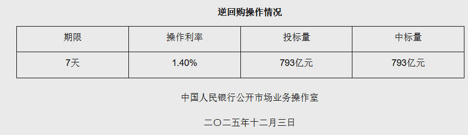 據央行網站消息,2025年12月3日中國人民銀行以固定利率、數量招標方式開展了793億元7天期逆回購操作。具體情況如下: