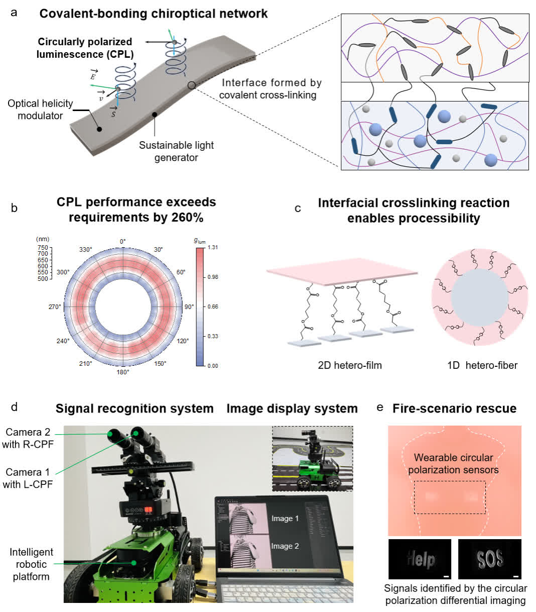 在濃煙、強光、複雜背景干擾等極端環境中,傳統光學成像技術(如強度成像、光譜成像及紅外熱成像)常因信息維度單一,導致識別率下降、目標隱匿的困境。據介紹,偏振作為光的重要屬性,能夠提供強度與波長之外的深層信息。其中,圓偏振光在傳播過程中具備特定的旋轉方向和優異的保偏性,為突破複雜環境成像瓶頸提供可能。然而,如何實現圓偏振發光材料在承受大幅機械形變時仍保持高圓偏振信號,是實現柔性可穿戴圓偏振成像的重要挑戰。