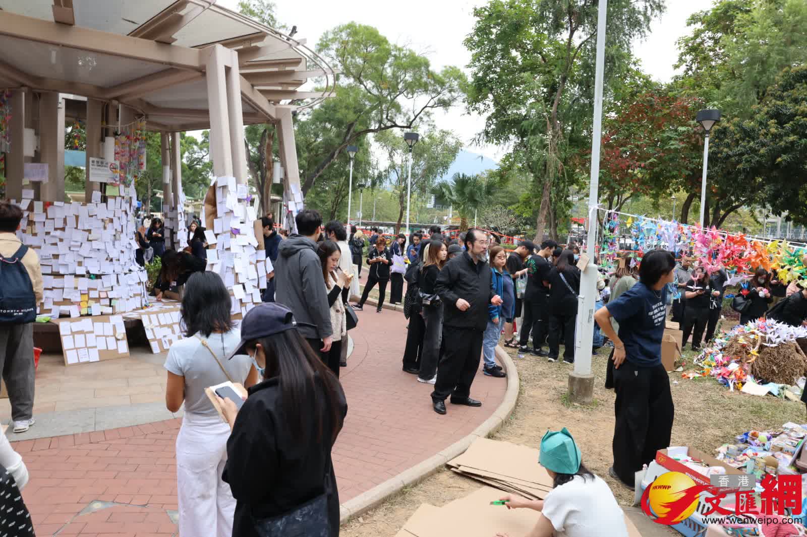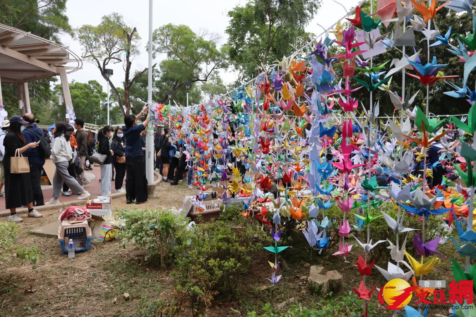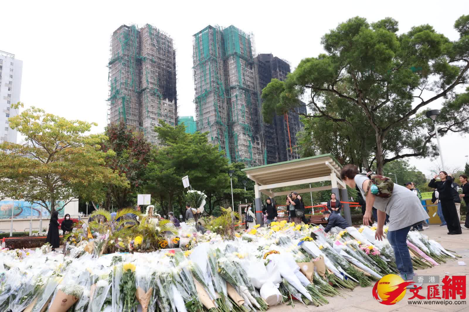 香港文匯報訊(記者 蕭景源)大埔宏福苑發生五級火警,造成多人死傷,全港哀悼。今日(3日)繼續有市民到達毗鄰宏福苑的廣福邨休憩公園悼念逝者,除了無數鮮花及心意卡外,更不斷有市民掛起一串又一串親手摺製的紙鶴,形成「紙鶴林」;其間不少市民在獻花後,留在休憩公園遙望宏福苑合什或閉目默禱,希望逝者早日安息。