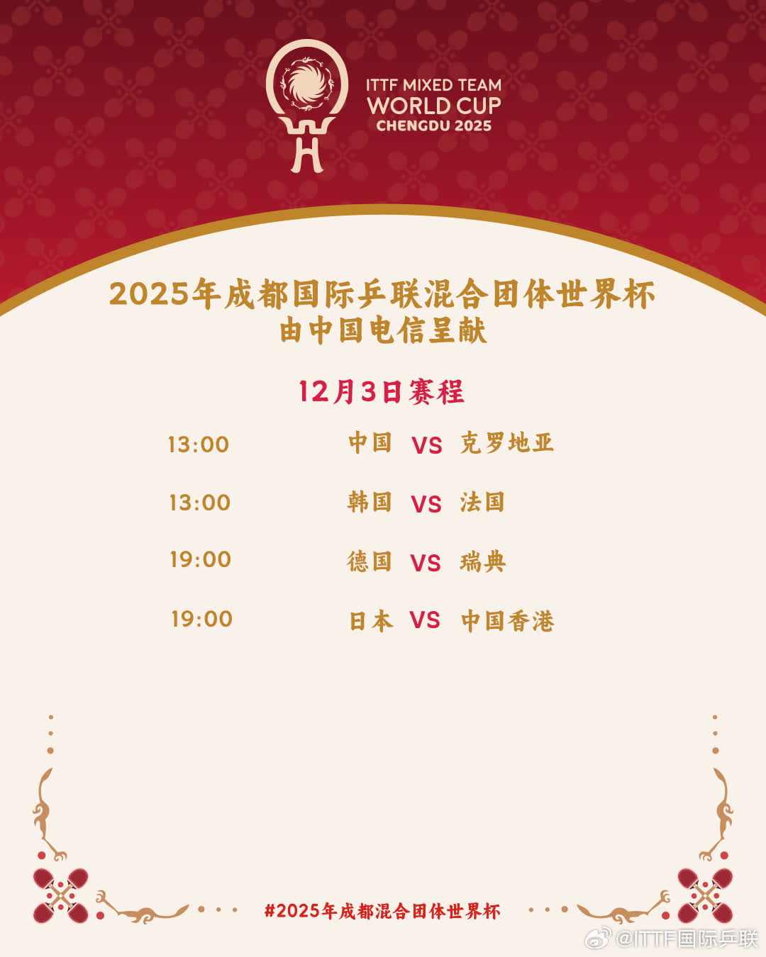 12月3日,2025國際乒聯混合團體世界盃在成都繼續進行。第二階段第一輪,中國隊以大比分8比0戰勝克羅地亞隊,收穫開賽以來的四連勝!