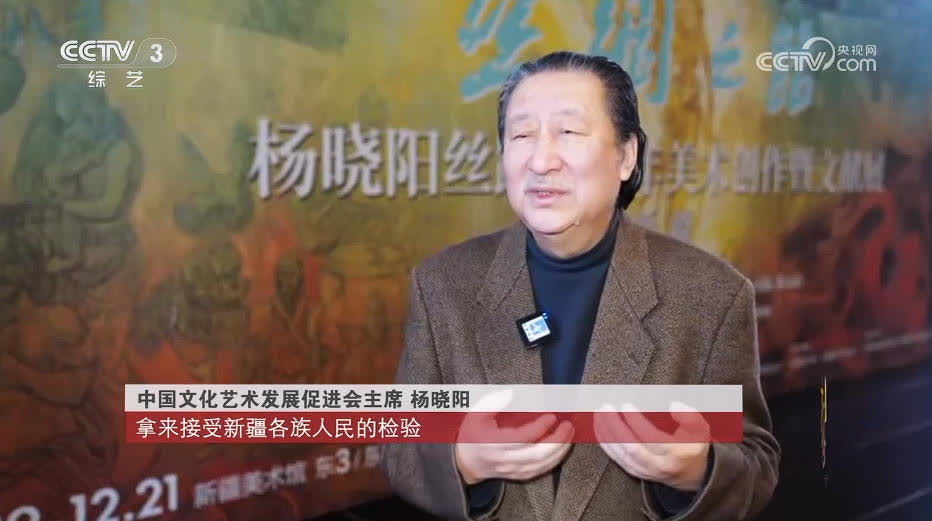 中國文化藝術發展促進會主席 楊曉陽:我對絲綢之路這個興趣,始終如一地追求絲綢之路的現象、本質,它的文化,它的藝術,它在人類歷史過程中起到的推動作用。人類互相理解、互相合作、互相支持,文化在交流的過程中共同發展,我也希望把我40年的成果拿來接受新疆各族人民的檢驗。
