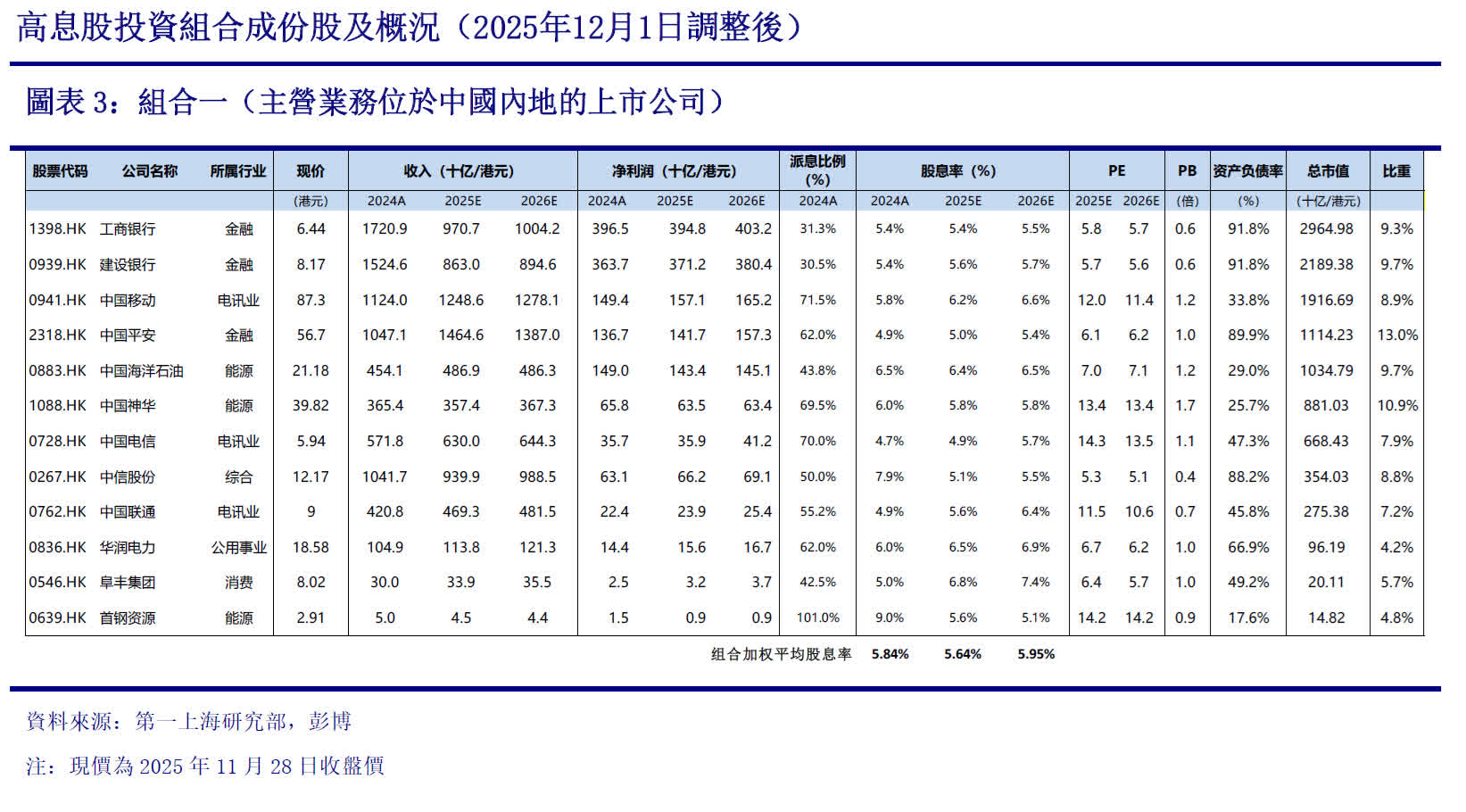 基於此,我們維持「攻守兼備」的配置思路及既定篩選標準(主營穩健、高分紅意願、低負債及低資本開支),並結合最新基本面變化對組合進行微調:
