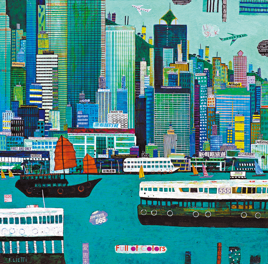 近20年前,生於意大利的Francesco Lietti從倫敦來到香港,並因香港美好的氛圍而選擇定居於此。在這裏,他的身份從建築設計師轉為藝術家。其過往的畫作,常帶有高飽和度的色彩與充滿建築師眼光的幾何線條。他也特別喜歡混合媒材的運用。呈現在他畫作中的香港,充滿活力,甚至帶着一點魔幻色彩。