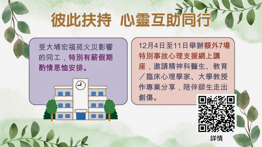 為持續關顧同工的心靈健康,同時讓更多學校人員及家長了解學童在創傷事件後常見的身心反應及情緒需要,局方將於本月4日至11日舉辦額外7場網上特別事故心理支援講座,邀請精神科醫生、教育或臨床心理學家、大學教授等作專業分享。蔡若蓮指,危機事故後的復原過程因人而異,有些人可能需要輔導專業人員的支援,教育局整合了針對是次事故的社區支援服務及資訊,包括政府、大學及專業團體的資訊,並已上載於教育局「學校危機處理」專頁。