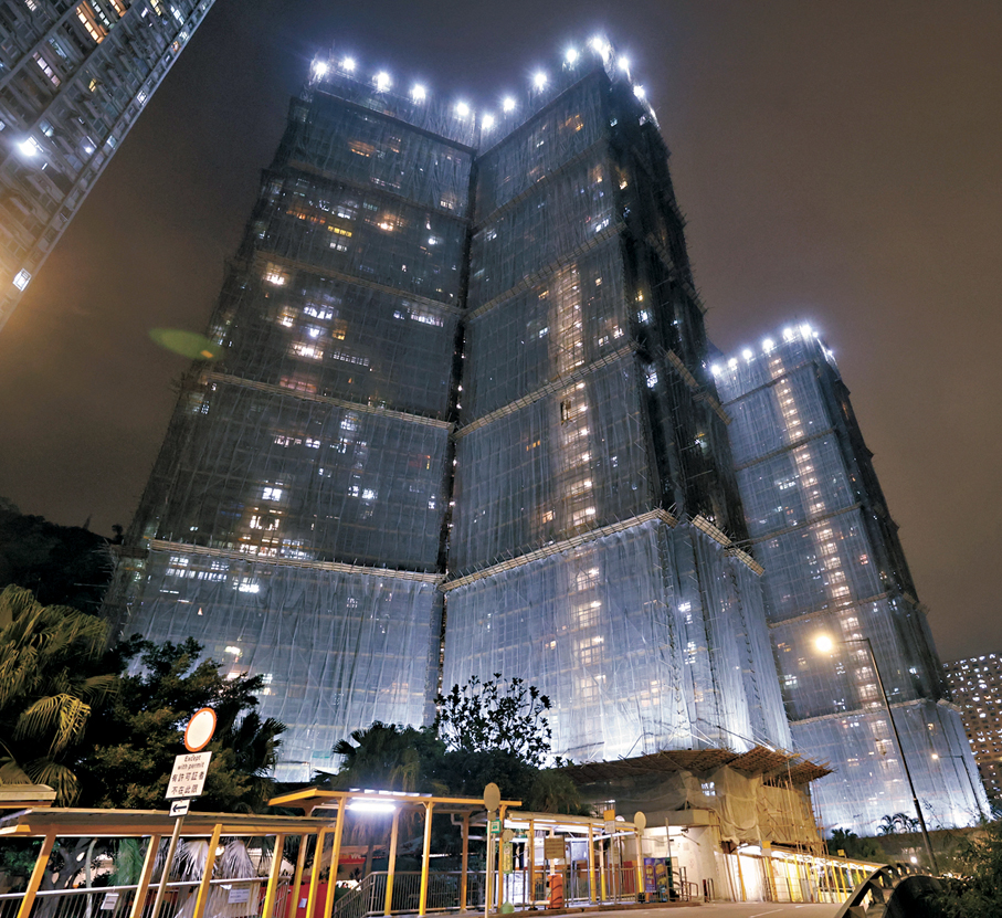 香港文匯報記者昨晚在炮台山富澤花園所見,大廈外牆竹棚及棚網已被拆除,而柴灣峰華邨的樓宇則仍被棚架和棚網包裹。