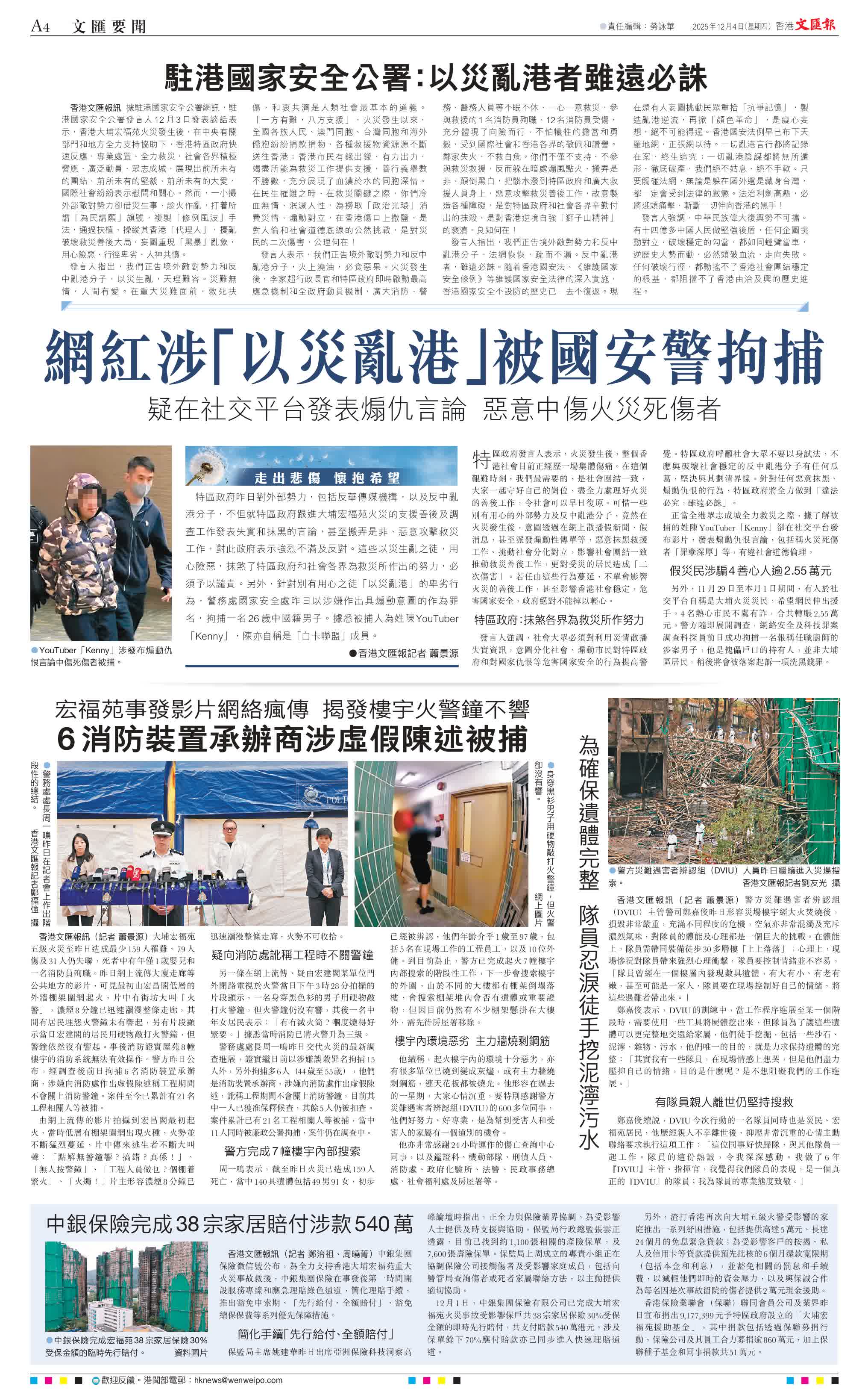 香港文匯報訊(記者 蕭景源)特區政府昨日對外部勢力,包括反華傳媒機構,以及反中亂港分子,不但就特區政府跟進大埔宏福苑火災的支援善後及調查工作發表失實和抹黑的言論,甚至搬弄是非、惡意攻擊救災工作,對此政府表示強烈不滿及反對。這些以災生亂之徒,用心險惡,抹煞了特區政府和社會各界為救災所作出的努力,必須予以譴責。另外,針對別有用心之徒「以災亂港」的卑劣行為,警務處國家安全處昨日以涉嫌作出具煽動意圖的作為罪名,拘捕一名26歲中國籍男子。據悉被捕人為姓陳YouTuber「Kenny」,陳亦自稱是「白卡聯盟」成員。