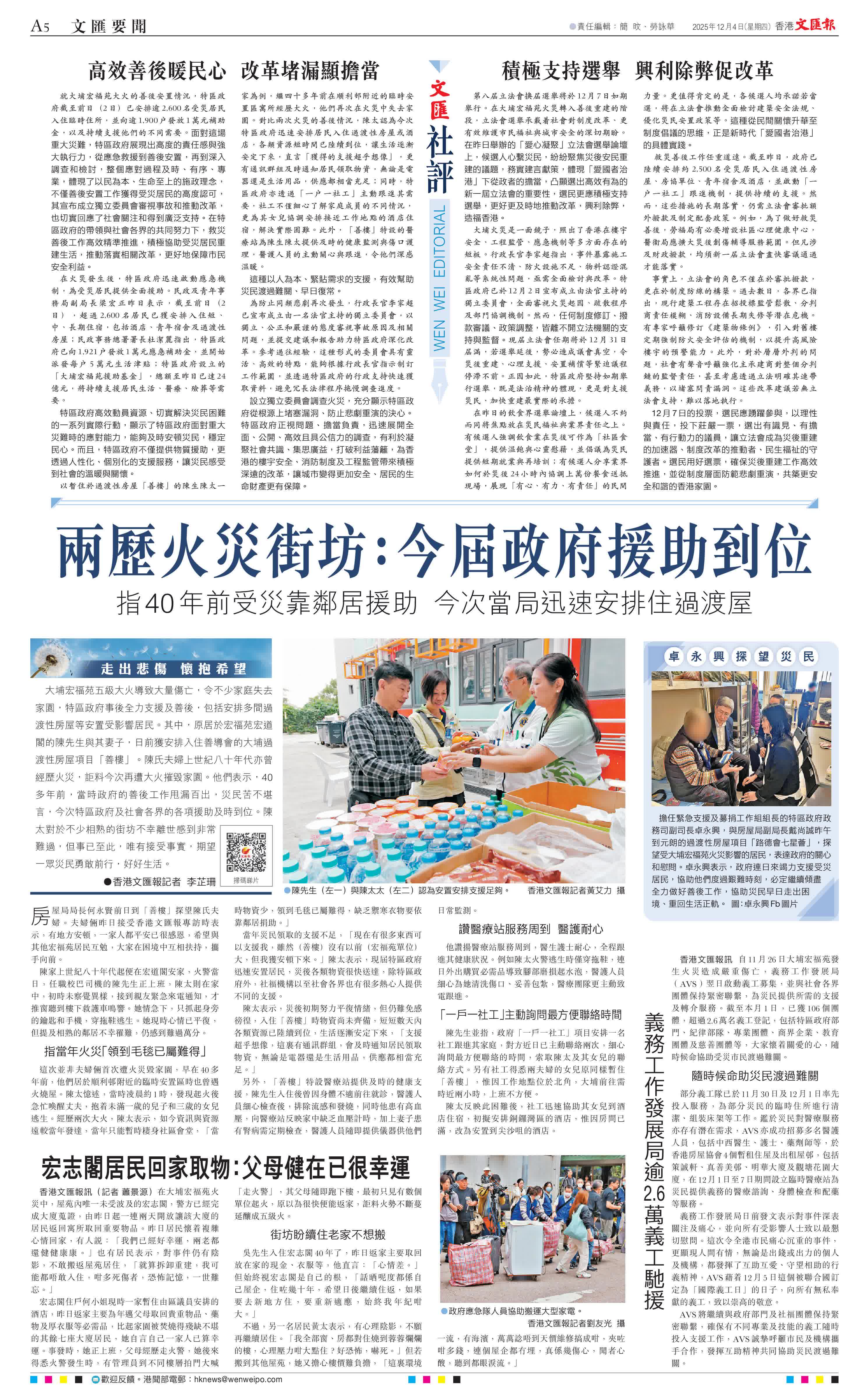香港文匯報訊(記者 蕭景源)在大埔宏福苑火災中,屋苑內唯一未受波及的宏志閣,警方已經完成大廈蒐證,由昨日起一連兩天開放讓該大廈的居民返回寓所取回重要物品。昨日居民懷着複雜心情回家,有人說:「我們已經好幸運,兩老都還健健康康。」也有居民表示,對事件仍有陰影,不敢搬返屋苑居住,「就算拆卸重建,我可能都唔敢入住,咁多死傷者,恐怖記憶,一世難忘。」