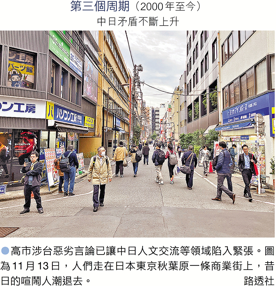 第三個周期就是2000年至今,中日關係出現政治、安全矛盾不斷上升,呈現出惡化容易改善難的特點。中日之間也只是在經貿、養老、環境這類功能性領域進行務實合作,台灣、歷史、釣魚島這些結構性矛盾沉渣泛起。這也是因為第一個長周期裏右翼反華勢力的孫輩上台,以安倍為典型,高市早苗則是其中最極端的例子,導致結構性矛盾全面爆發,當前正處於爆發期。