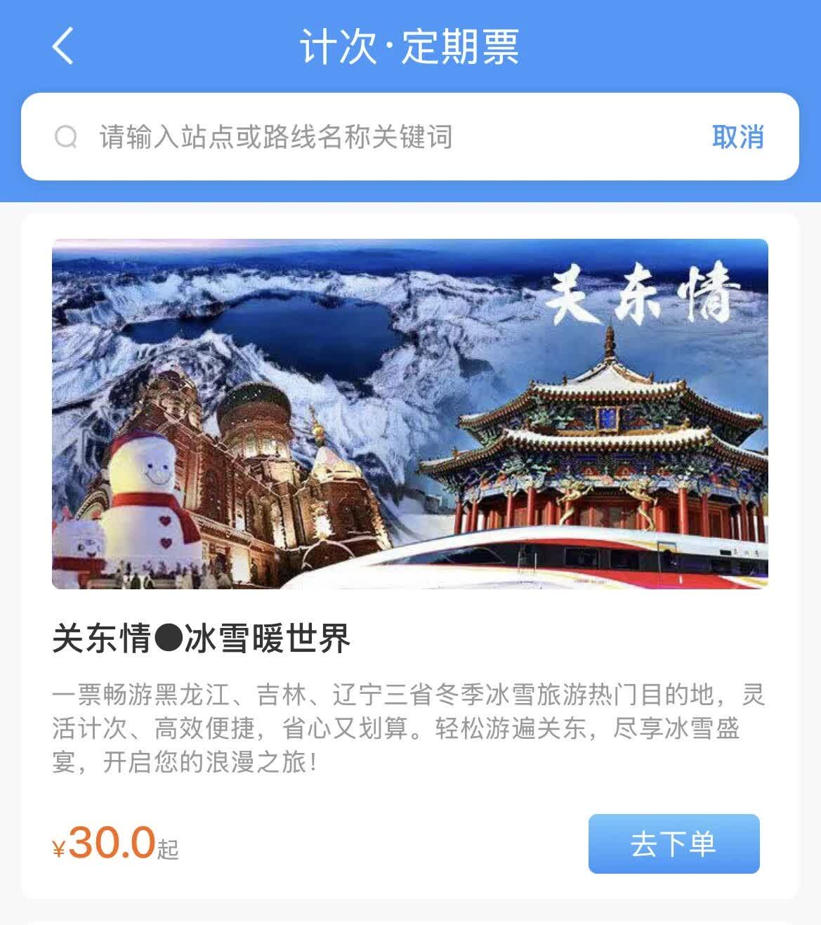 「關東情·冰雪暖世界」旅遊計次票覆蓋丹東、大連、大連北、瀋陽、瀋陽北、延吉西、長白山、長春、長春西、哈爾濱西、哈爾濱、亞布力西、橫道河子東、牡丹江14座車站。