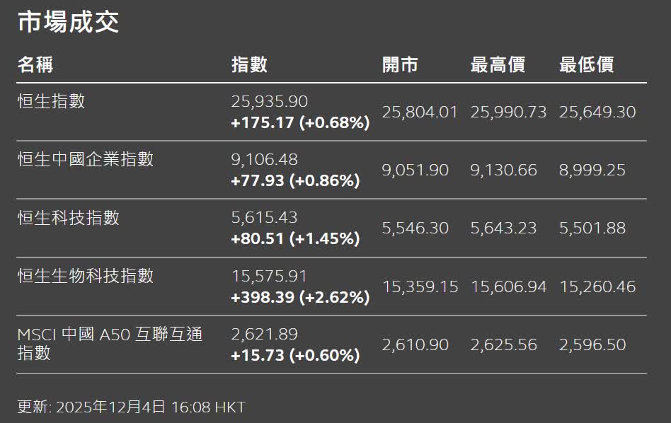 香港文匯報訊 經過周三震盪,港股今日呈反彈勢頭。恒生指數收報25,935點,全日升175點或0.68%。國企指數升0.86%。恒生科技指數升1.45%。大市成交約1,793億元,比周三的約1,644億元略升。