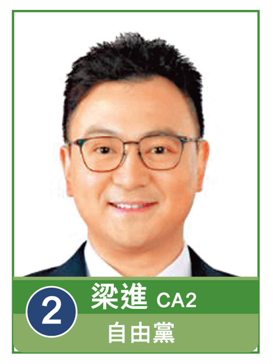 飲食界CA2號候選人梁進自2020年起擔任南區區議員,同時兼任現代管理(飲食)專業協會副主席及香港飲食業聯合總會發言人。梁進的競選口號為「百味融合創『食』代,齊心攜手開新路」,他還提出6項政綱,包括推動擦亮香港「美食之都」金字招牌、加強專業人才培育、推動便利營商環境、支持業界轉型升級、配合融入北部都會區發展、開拓清真市場。他認為飲食界需要多元發展,未來將會向特區政府反映業界需要,爭取更多政策及資源,與業界共同打造更有利的營商環境,為市民帶來更安全、更優質、更具特色的食品選擇。