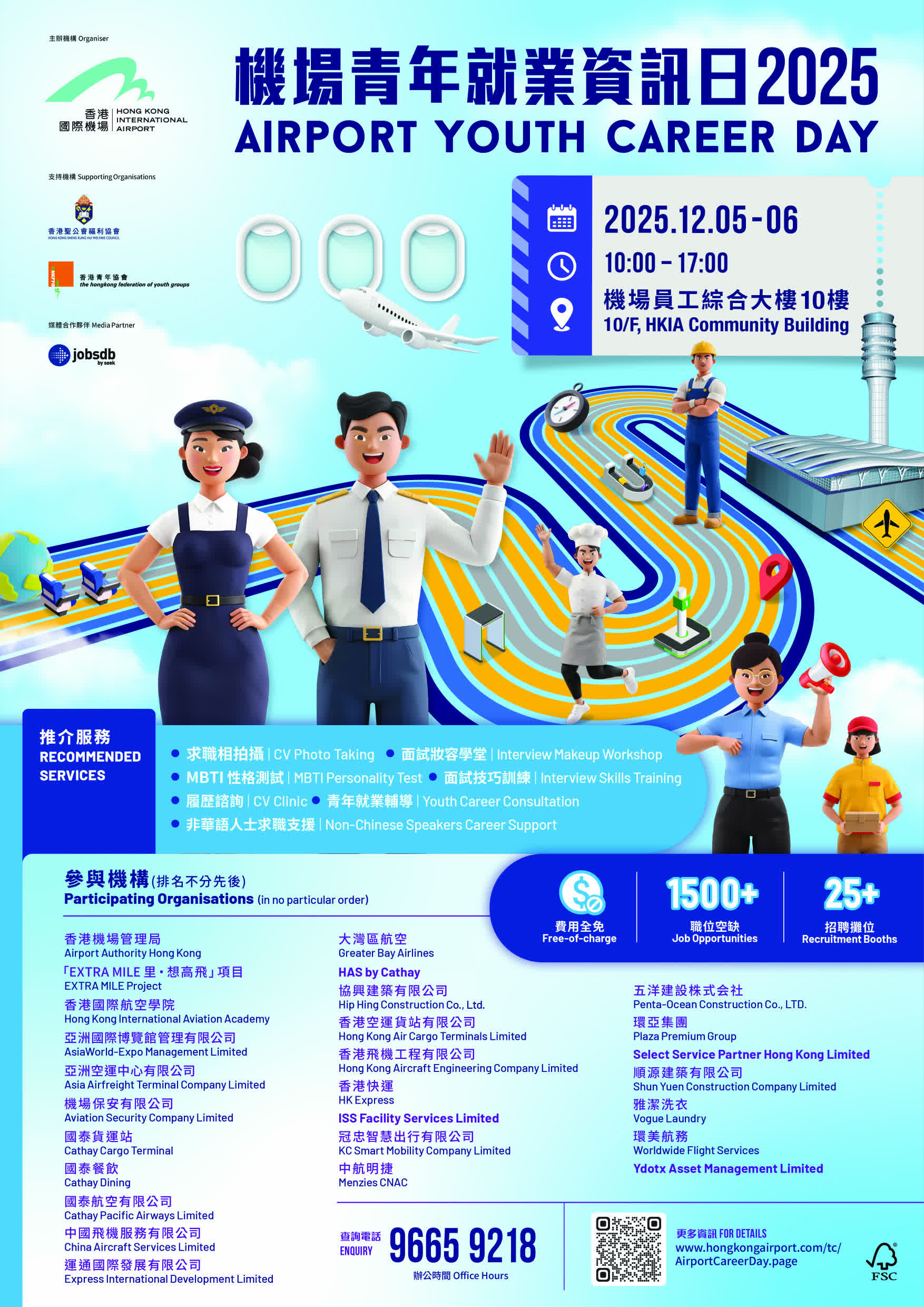 資訊日在機場員工綜合大樓10樓舉行,工種涵蓋飛機工程維修、地勤、貨運、航空保安等多個崗位。現場亦設有就業講座、工作坊等,為求職者提供簡歷撰寫、面試技巧、履歷照片等建議。