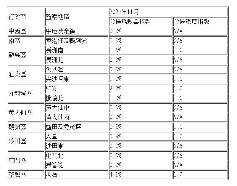 食環署至今已公布2025年11月共8批白紋伊蚊誘蚊器指數,涵蓋共64個監察地區。與上月(即2025年10月)的分區白紋伊蚊誘蚊器指數相比,這64個監察區中,50個監察地區的指數下跌或保持不變,代表蚊患情況改善或維持低水平;另有14區的指數輕微上升,但指數低於10%。