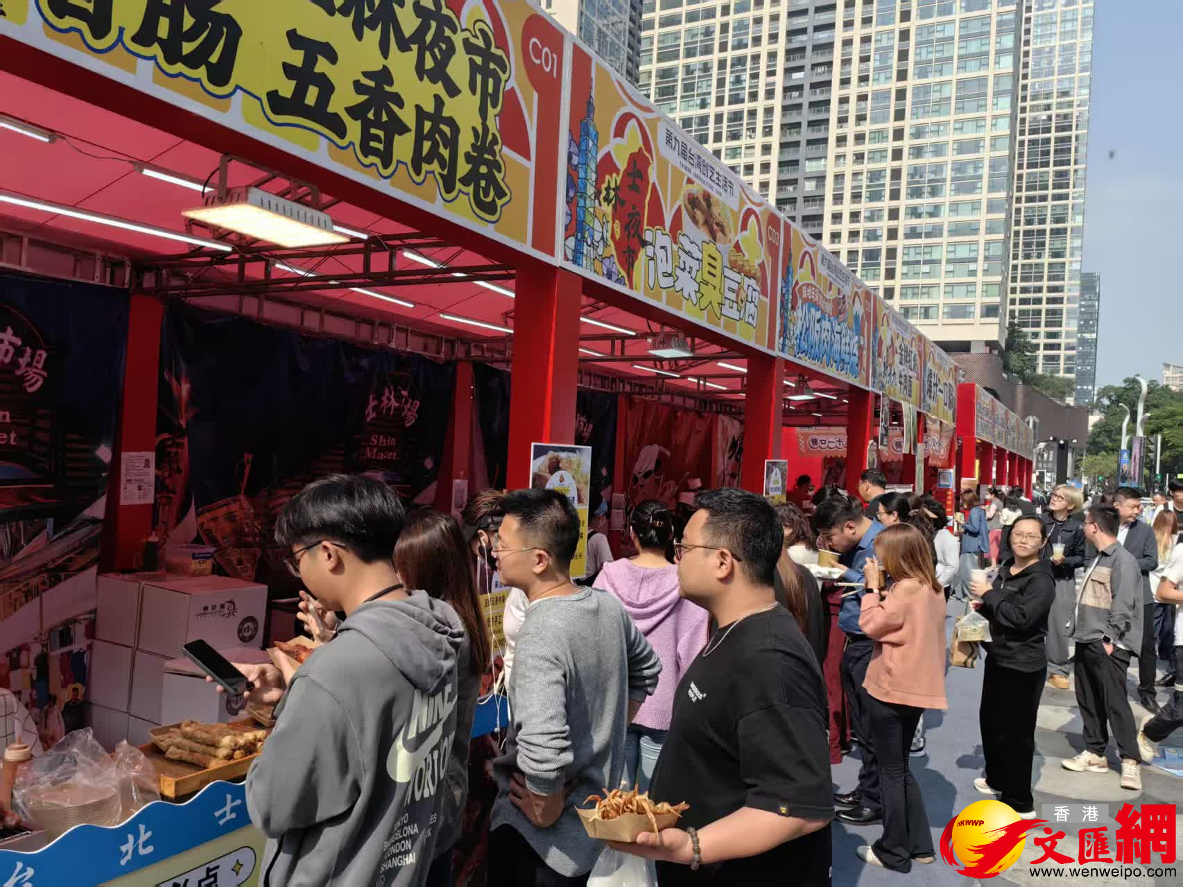 剛走進美食聚落,台北士林夜市的招牌香氣就撲面而來——首次來深的士林攤商正忙着翻烤碳烤雞排,油花滋滋作響;隔壁攤位的「古早味刈包」剛出爐,蓬鬆的麵皮裹着鹵得酥軟的五花肉,咬上一口滿是咸香。「這刈包咱叫『虎咬豬』,諧音『福咬住』,就是要把好運帶給深圳朋友!」攤主陳文松一邊給食客遞上紙巾,一邊笑着解釋這份台灣小吃的美好寓意。