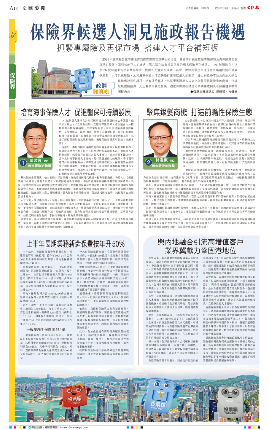2025年施政報告重申香港作為國際風險管理中心的地位,特區政府銳意推動專屬保險及再保險業務在香港的發展。面對如此巨大的機遇,第八屆立法會換屆選舉的兩名保險界別候選人:IN1號陳沛良,以及IN2號林溢東均熟知業界需求,提出目光遠大的政綱。其中,陳沛良關注本地保險市場趨於飽和且競爭激烈,人才供應短缺,尤其海事保險人才流失是行業發展最大的瓶頸,提出與更多本地及內地大學合作推出針對性課程,培育保險專才。林溢東則瞄準人口老化與醫療挑戰帶來的商機,建議聚焦銀髮經濟、北上醫療與養老發展,強化保險業在構建可持續醫療與長者照護體系中的關鍵角色。 ●香港文匯報記者 周曉菁、岑健樂