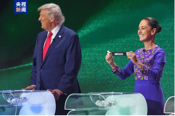 記者當地時間12月5日獲悉,當天,美國總統特朗普在世界盃抽籤儀式上首次與墨西哥總統辛鮑姆會面。