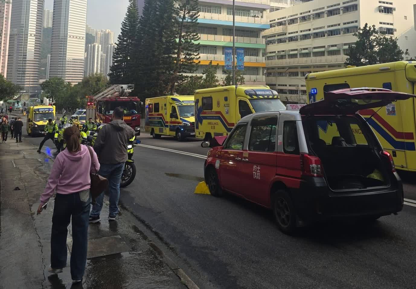 香港文匯報訊(記者 蕭景源)今日(6日)下午近3時,一輛垃圾車沿葵盛圍落斜駛至298號對開彎位時,懷疑失控越線與上斜駛至一輛巴士及的士發生迎頭相撞,初步最少10人受傷,幸傷勢不太嚴重;救護人員趕至為傷者初步包紮治理,分批由救護車送院治理。警方正調查車禍原因。