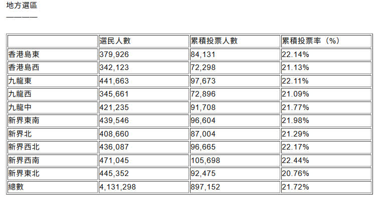 在10個地區直選中,新界西南選區投票率仍然最高,近10萬6千名登記選民已投票。其次是新界西北,近9萬7千名登記選民已投票。投票率最低是新界東北選區,逾9萬2千人投票。