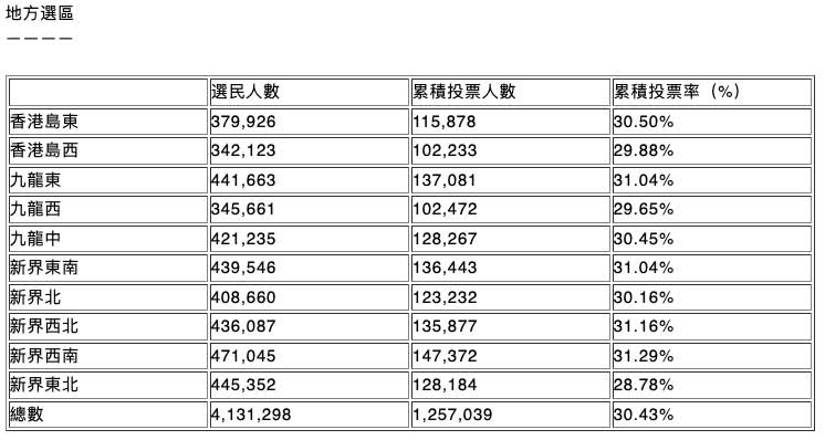 在10個地區直選中,新界西南選區投票率保持最高,累計有31.29%,逾14萬7千名登記選民已投票。其次是新界西北,累計有31.16%,近13萬6千名登記選民已投票。至於九龍東選區,投票率為31.04%。