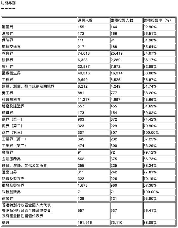 在功能界別方面,商界(第三)及科技創新界的選民全部投票。代表人大及政協等界別,以及漁農界投票率都超過96%。截至9時半,功能組別整體投票率38.09%,高過上屆的32.22%。