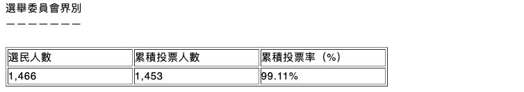 選舉委員會界別方面,在1466名登記選民中,已有1453人投票,投票率為99.11%,高過上屆的98.48%。