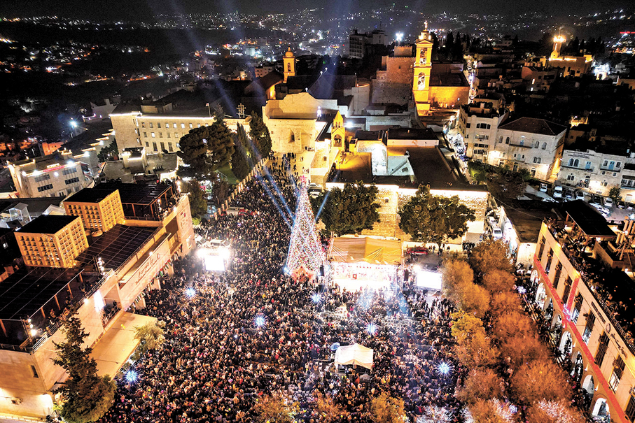 數千名來自約旦河西岸和以色列的巴勒斯坦民眾聚集在馬槽廣場,當聖誕樹亮起時,現場爆發出歡呼聲。這棵掛滿紅色與金色球飾的聖誕樹,距離主誕堂僅數米,已成為希望的象徵。