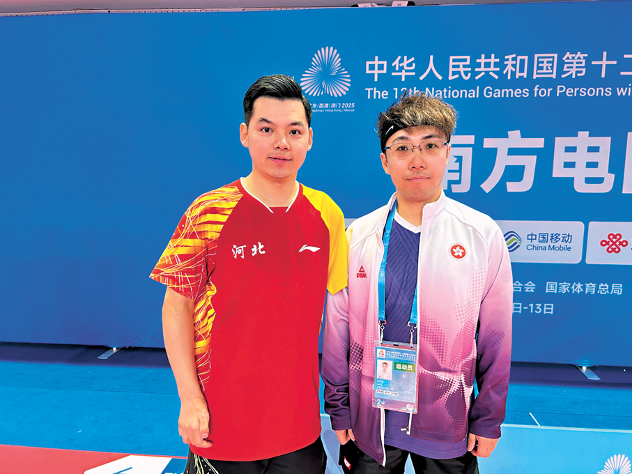 全國第十二屆殘疾人運動會暨第九屆特殊奧林匹克運動會(下稱「殘特奧會」)乒乓球項目,昨日迎來首個誕生獎牌的比賽日,在TT9(肢體殘疾組)團體比賽金銀牌爭奪戰中,港隊1:3不敵由四屆奧運會金牌得主、乒壇傳奇趙帥領銜的河北隊,收穫一面寶貴的銀牌,創造了港隊在殘特奧會乒乓球團體比賽的歷史最好戰績。在隨後的TT8男子團體賽中,港隊在循環賽戰勝安徽隊奪得銀牌,港隊一日收穫兩銀超出預期。港隊教練組表示,今次奪銀是對全隊每天四五個小時艱苦訓練付出的最好獎賞。