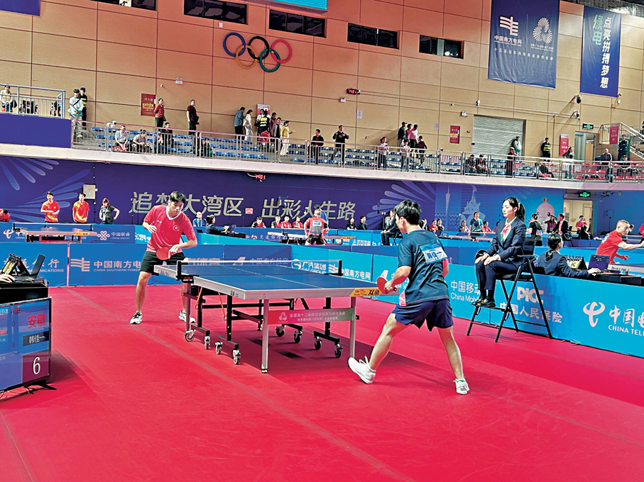 殘特奧會乒乓球競體比賽12月5日在廣州體育職業技術學院開賽,全國31支隊伍318名運動員在廣州賽區展開角逐,共產生68面金牌。其中,港隊共派出30名運動員,在所有參賽隊伍中規模最大,參與輪椅組、站立組、聽力殘疾組三個組別各項目的角逐。在率先打響的團體賽中,港隊TT9組在循環賽中展現出較高的競技水平,在循環賽首場比賽中以3:0戰勝海南隊,次戰又以同樣的比分戰勝四川隊。昨日,港隊與河北隊相遇,勝者將獲得男子團體TT9組別冠軍。