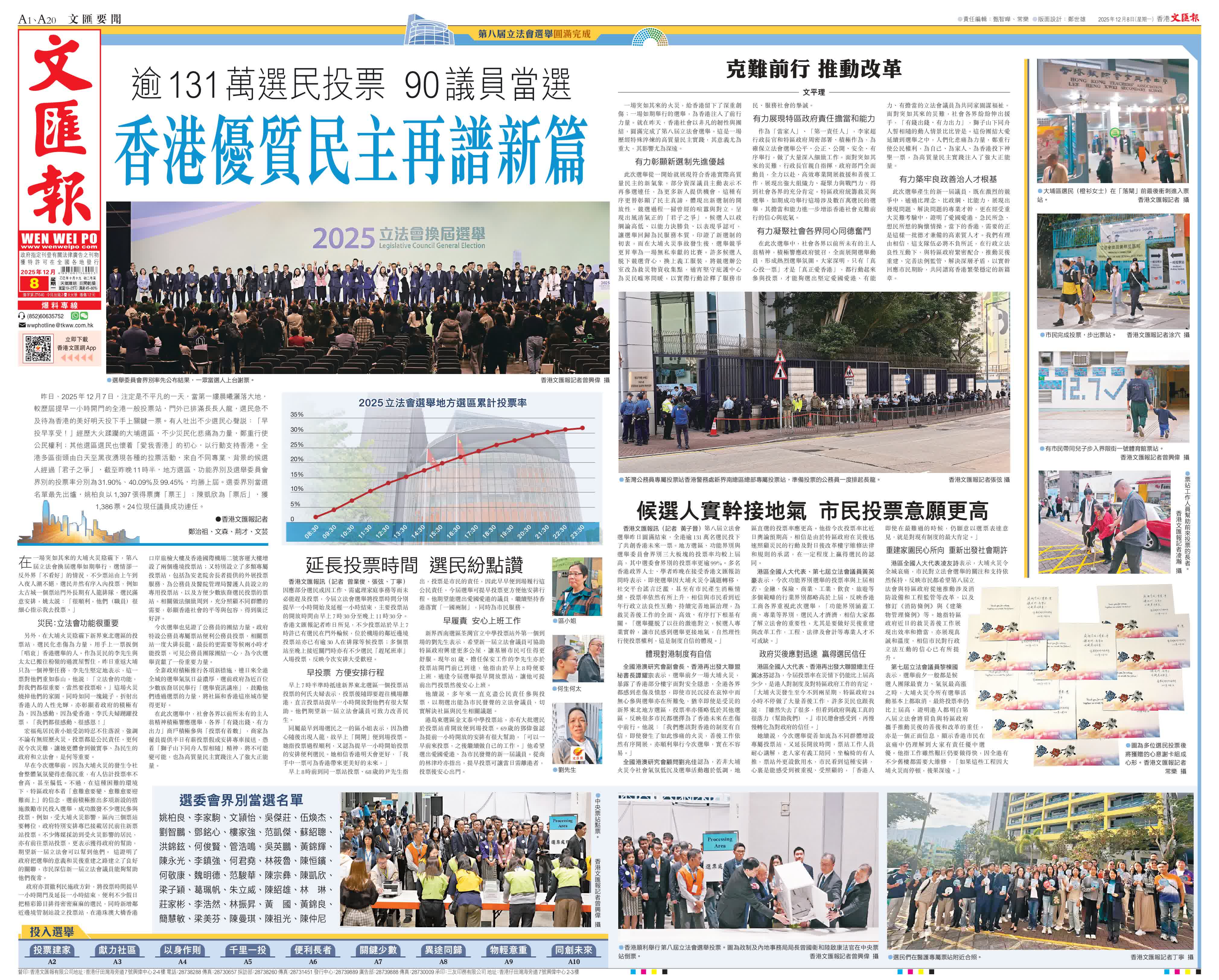 香港文匯報訊(記者 鄭治祖、文森、荊才、文芸)昨日、2025年12月7日,注定是不平凡的一天,當第一縷晨曦灑落大地,較歷屆提早一小時開門的全港一般投票站,門外已排滿長長人龍,選民急不及待為香港的美好明天投下手上關鍵一票。有人吐出不少選民心聲說:「早投早享受!」經歷大火蹂躪的大埔選區,不少災民化悲痛為力量,鄭重行使公民權利;其他選區選民也懷着「愛我香港」的初心,以行動支持香港。全港多區街頭由白天至黑夜湧現各種的拉票活動,來自不同專業、背景的候選人經過「君子之爭」,截至昨晚11時半,地方選區、功能界別及選舉委員會界別的投票率分別為31.90%、40.09%及99.45%,均勝上屆。選委界別當選名單最先出爐,姚柏良以1,397張得票膺「票王」;陳凱欣為「票后」,獲1,386票。24位現任議員成功連任。