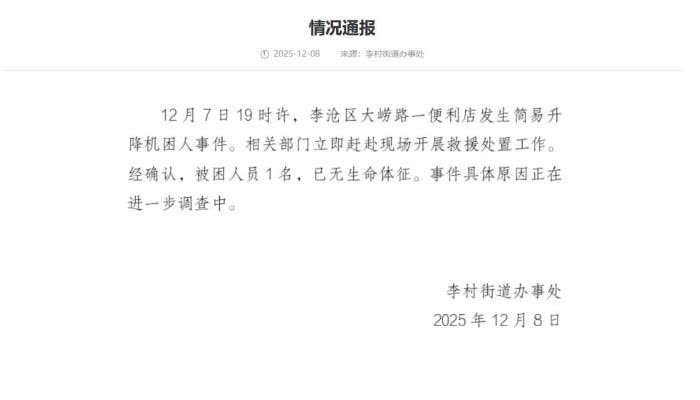 青島李村街道辦事處8日在青島李滄政務網發布情況通報稱,12月7日19時許,李滄區大嶗路一便利店發生簡易升降機困人事件。相關部門立即趕赴現場開展救援處置工作。經確認,被困人員1名,已無生命體徵。事件具體原因正在進一步調查中。